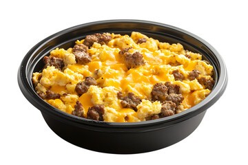 Hash browns, scrambled eggs, bacon, sausage, country gravy, topped with cheddar cheese in an individual bowl. Requires a minimum of 10 servings per order.