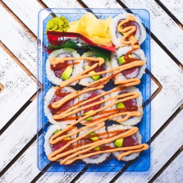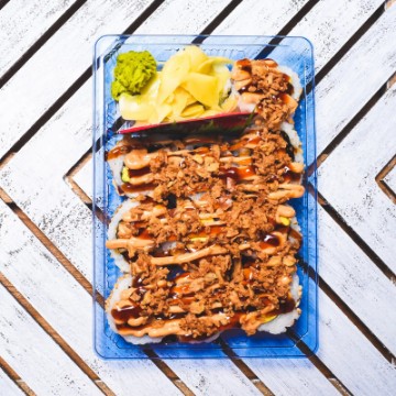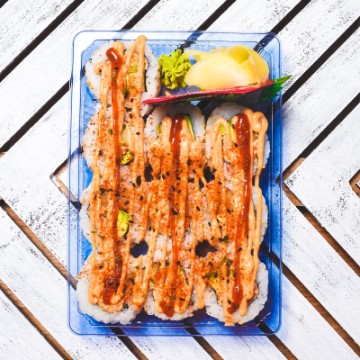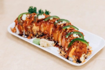 Crab Stick, Cucumber, Avocado topping with Spicy Mayonnaise, Sushi Sauce, and Fried Onions