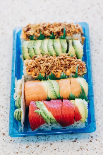 California Roll topped with Avocado slices, Tuna and Salmon