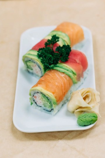 <p>California Roll topped with Avocado slices, Tuna and Salmon</p>
